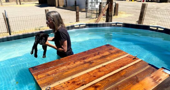 Roxy’s medical exam didn’t uncover any injury, but her hind legs seemed weaker than they should be. At a recent puppy pool party, they trembled visibly after her swim, despite the assistance of Sanctuary Operations Manager Laura Finley. The pup was tired, but water therapy would help strengthen her muscles.