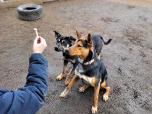 Home » 3 stray dogs rescued last summer learning to accept humans at their own pace » 3 stray dogs_Mindy and Junior waiting for treat