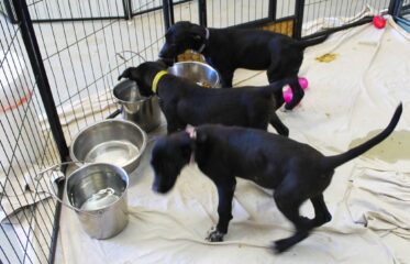 According to Operations Manager Laura Finley, the first thing the puppies did, when staff cut the wires and let them out, was relieve themselves. They’d been waiting all day, trying not to soil the crate. They must have been desperate. Despite their emaciated condition and bloated worm bellies, the puppies were able to drink on their own. Staff limited their intake to prevent a shock to their systems.