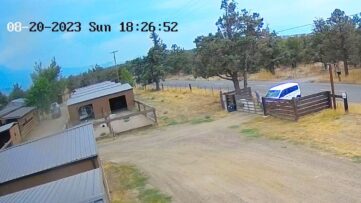 Within 2 minutes, an ATV towing a small trailer comes down the road and parks behind the closed gate. The driver lifts the crate out, drags it into place, and leaves with an empty trailer. The whole process takes just over 30 seconds.