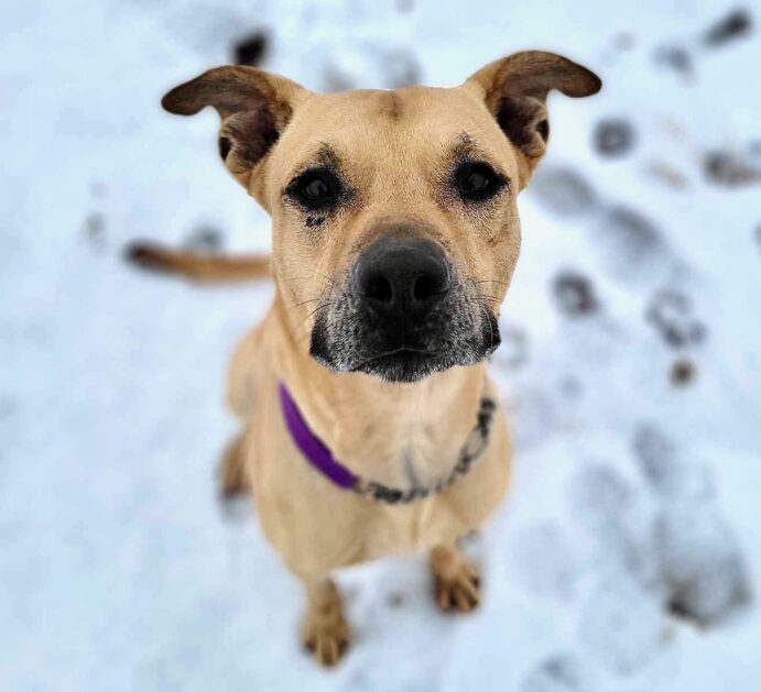 Noah’s Ark transferred Jackson to our care at the end of 2023. Though Rescue Ranch is constantly occupied with rescuing strays and unwanted dogs here in Siskiyou County, we transfer at-risk dogs from outside the county whenever possible. Jackson’s intake photos show a thin dog peering wistfully at the camera from a snowy background.