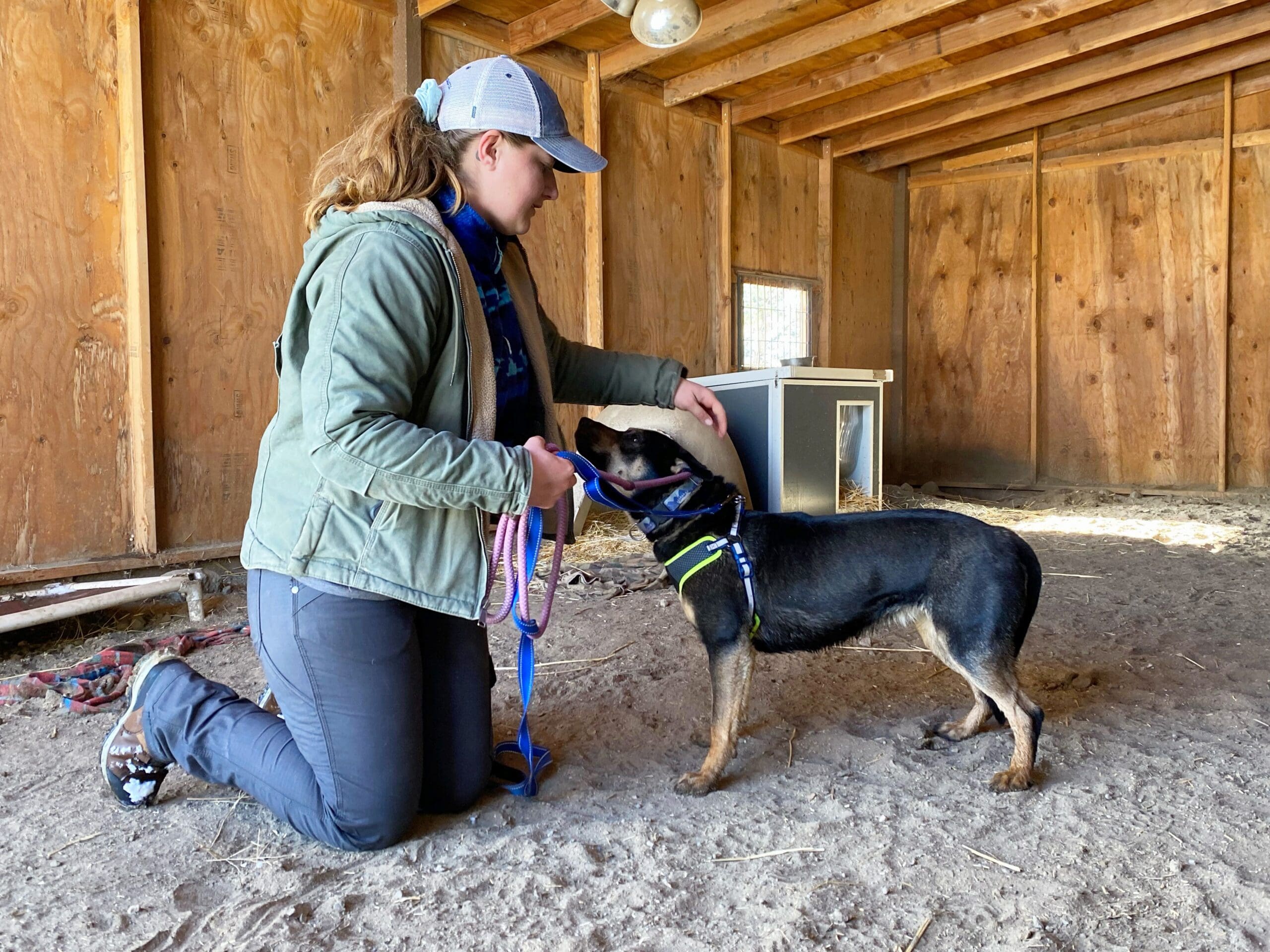Home » A Scared Dog Makes Progress At The Sanctuary And Learns To Trust » Scared dog_Sydney Preparing to remove Mindy harness