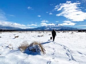 WS Sydney and Mindy silhouetted against Mt shasta backdrop walking away January 17, 2024 by Natalie Golay