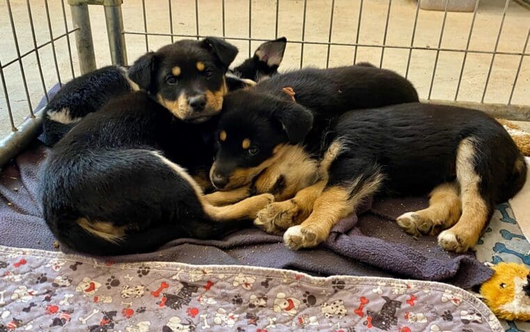 The same day, our partner Karen Topping was returning home when she saw a stray momma and puppies scavenging just around the corner from the Sanctuary. Karen jumped out and caught the puppies, but momma proved too skittish and disappeared onto a neighboring property. These pups have not had much human contact, so caregivers are taking turns cuddling them to help them gain confidence.