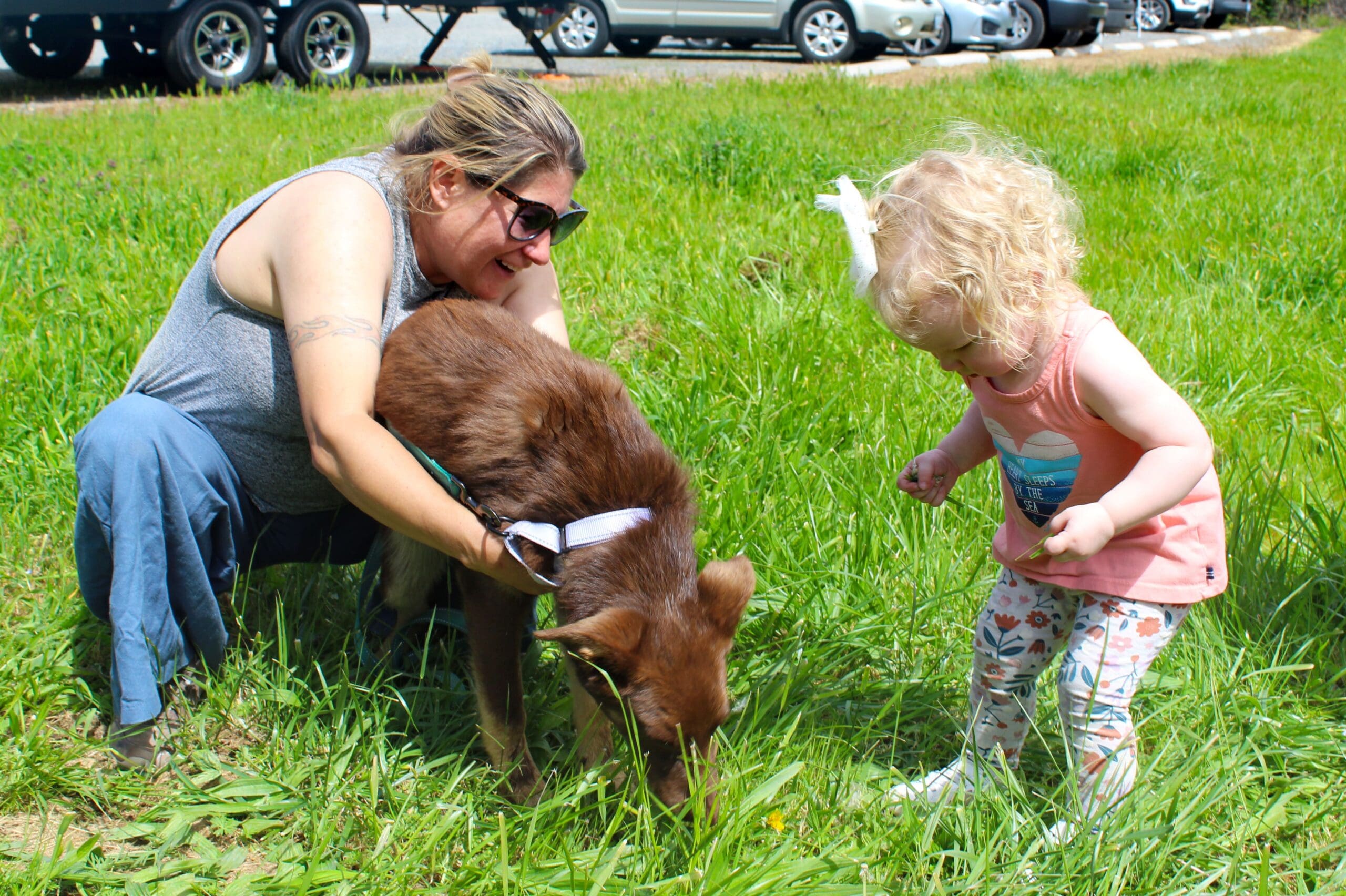 Dog adoption_foster Shannon with Peony and adopters child 1