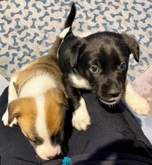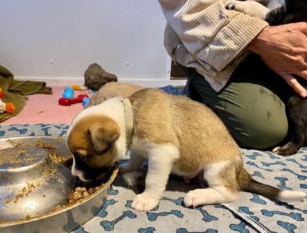 Without the resources for puppy rescue, animal control turned the puppies over to us. Fortunately their puppy teeth were in and they were able to start on solid food. No bottle feeding required this time. Thank goodness!