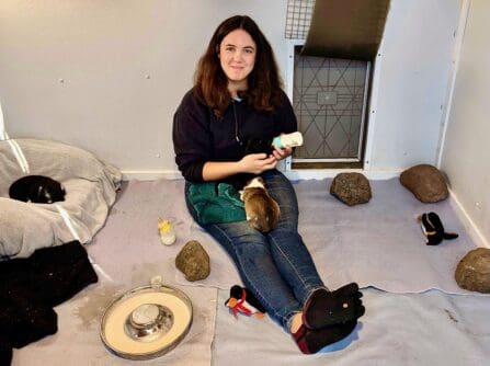 It looks like the “Halloween pitties” might grow up to be pocket-sized pits. After two weeks of nourishing food they’re still quite small. They’re absolutely obsessed with human visitors. Both times I stopped by, they were so busy competing for cuddles that it was hard to get pictures. And they’re feisty little terriers! Sanctuary operations manager Laura Finley says little blue-and-white Penny is “a pistol” who chases anything that moves. These adorable wrinkly babies will be ready to go home in early December.