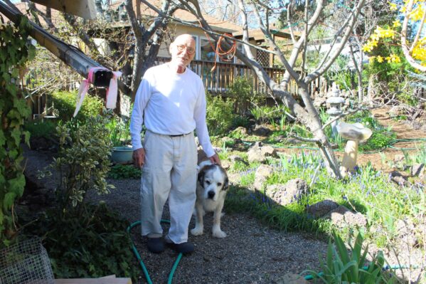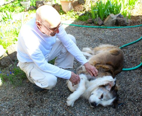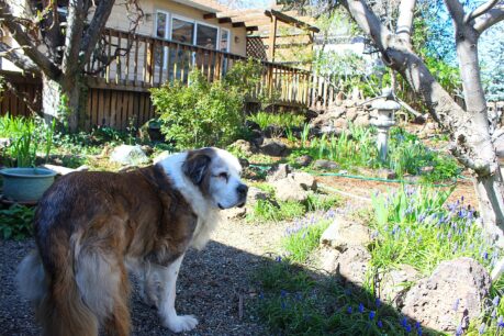 Miss Molly strolled through the yard to a comfortable spot in the shade. She enjoyed ear scritches and a belly rub as Rajiv described life with the St Bernard.