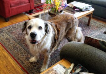 All in all, Miss Molly appears very happy and leads a normal life. She’s pampered and loved, has the run of the house and yard, goes on daily walks, enjoys car rides, and takes field trips with her family. At night she sleeps in the bedroom on her own bed. As Rajiv and I chatted, she came up and nudged my leg; she’s such a cutie.