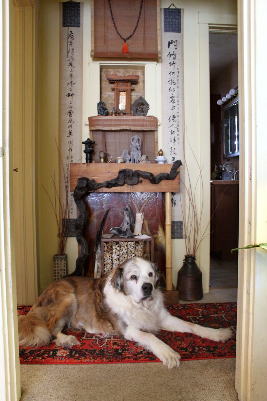 When I arrived, Miss Molly was fast asleep, resting up after her regular morning walk. We were in the living room where a fountain fed a small goldfish pond under the watchful eye of a laughing Buddha. At 11 years old, the diminutive St Bernard is no spring chicken, and requires extra time to recharge. She’s still going strong, though. When I encountered her on a walk with Rajiv a few weeks earlier, she had a spring in her step and engaged cheefully with her surroundings.