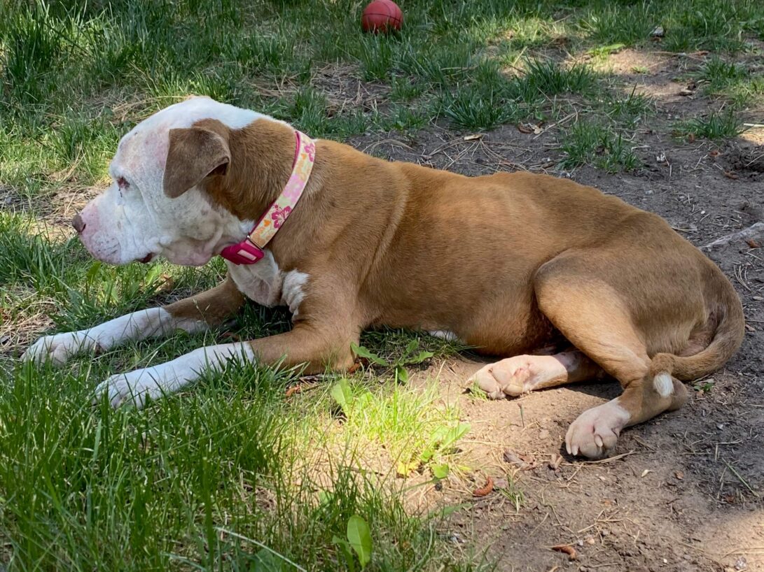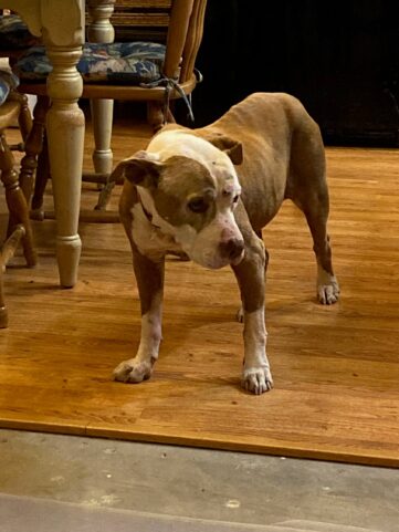 With a roof over her head, proper care, and plenty of good food, Spirit improved visibly. By the end of her first month with us, her coat was shinier, she had gained weight, and her sores were almost entirely healed. We looked forward to her full recovery and watching her go on to a long life as a beloved senior pet. The vet told us she was only about eight, which is at the very low end of senior for a pittie. She should have had many good years ahead of her. It wasn’t to be.