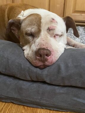 This October, we’ve been focusing on pitties, in honor of Pit Bull Awareness Month. We’ve debunked myths, discussed using doggone common sense instead, and tried to make the case for treating pit bulls like any other dog, because they are like any other dog. And, as with any other breed or type, sometimes they need help getting through their last days as comfortably as possible. Palliative care isn’t easy on fosters, but, as noted in a previous post about fostering special needs seniors, it’s worth the inevitable heartache. That opinion is shared by AliCarmen Carico. In this week’s article, she describes her family’s recent experience with dog hospice care.