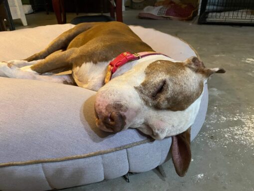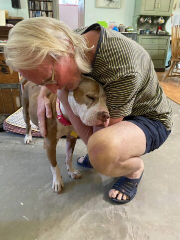 Our staff soon named the pittie “Spirit” because of her gentleness and resilience. She was exhausted yet grateful for every kindness. We gave her a few days at the Ranch to stabilize, and then I took her home to foster. At first, she recuperated in a shady kennel, away from our household animals. At night she snuggled in her Dogloo.