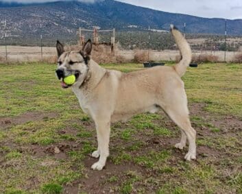 Boris has a huge personality as well as an impressive repertoire of obedience cues. He’s well-mannered, fully house-trained, crate-trained, and rides nicely in the car. He even knows about cats. Boris walks well on leash and though he sometimes gets excited and starts to pull, he has a way of apologizing with his eyes that is completely irresistible. He knows Sit, Stay, Down, Come, Leave it, Wait, and Let go. Add to this his benevolent heart and you have one awesome companion. Boris loves attention and is eager to please. He has a catlike way of lying on top of his kennel to keep an eye on the scenery. And he loves to carry his favorite ball everywhere and entertain himself by batting it around with his paws.