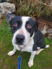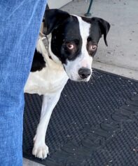 Mabel is very timid with new folks but always gentle. Since coming to the Ranch she’s learned to walk on leash and knows Sit. If you’re looking for a walking or jogging companion, Mabel’s your gal! Her foster mom says she loves her walks and would enjoy more exercise. Mabel is doing well in a home environment and is very smart. She loves peanut butter, collagen chews, and destroying “indestructible” dog toys. Overall she’s a quiet dog, but she’ll alert you to intruders and defend her home if she needs to. She needs time to gain trust around new people, so a calm home without a lot of visitors would be her cup of tea.