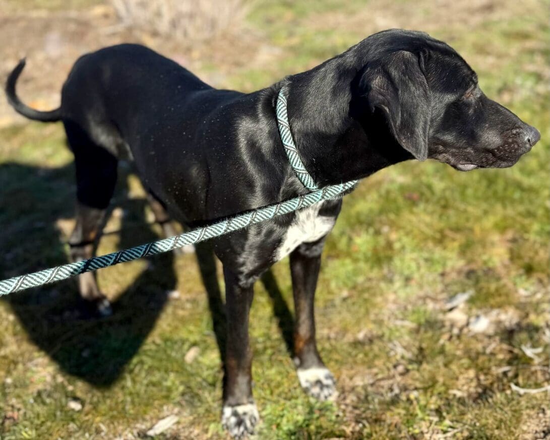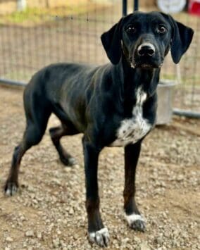 Panama is still young and like many pointer mixes, she’s got plenty of energy. We love her playful exuberance–and we also love how quickly she responds to positive reinforcement. She walks beautifully on leash and loves to work for treats and praise! She already knows Sit, Down, and Shake and will do just about anything you ask. Panama would excel in obedience, agility, or even as a hunting companion. She loves to be with people and has been known to bounce over fences to find her favorite humans. She’ll need a securely fenced yard to keep her safe and would be happiest with a doggy pal to keep her company. This social gal gets along with just about every dog she’s met here at the Ranch. Dog park anyone? She’s gentle and loving and would likely thrive in a family with kids.