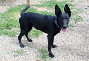 older black shep mix pup big ears blue collar