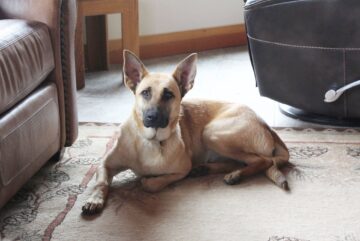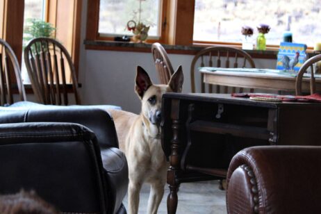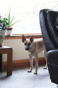 When I arrived, Gus, Kenna’s foster brother, greeted me with a friendly wag and a toy. For her part, Kenna was in constant movement. As Judy and I chatted in the kitchen, the anxious dog passed in and out of my peripheral vision, circling at a safe distance. If I turned to look, she’d freeze for a moment, peeking out from behind the furniture. An eye here, an ear and nose there.