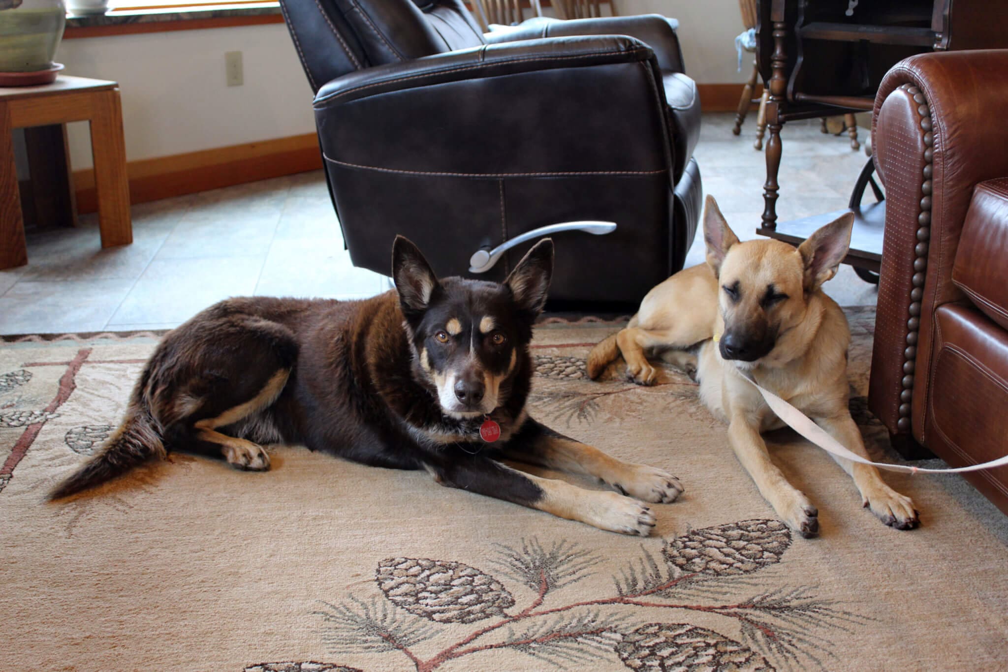 Home » Feral Stray Learning How To Trust With Help of Caring Rescue Ranch Volunteer » Kenna_relaxing next to Gus on leash_2