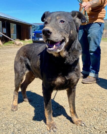 I first met Presley in the summer of 2021. When the Lava Fire spilled down the slopes of Mt. Shasta, my husband and I evacuated to Yreka. I volunteered at Rescue Ranch to pass the time while we were away. I cradled soot-coated Ash, the fire puppy, and helped build kennels for community dogs. And I met Paws and Presley, two adult dogs rescued with severe burns from the fire zone. I held Presley’s head while the triage team washed his legs, applied honey and bandaged his paws. I’ll never forget the look in Presley’s eyes during the ordeal. He hardly flinched, though the pain must have been terrible. His amber eyes gazed trustingly into mine–he simply surrendered himself to our care.