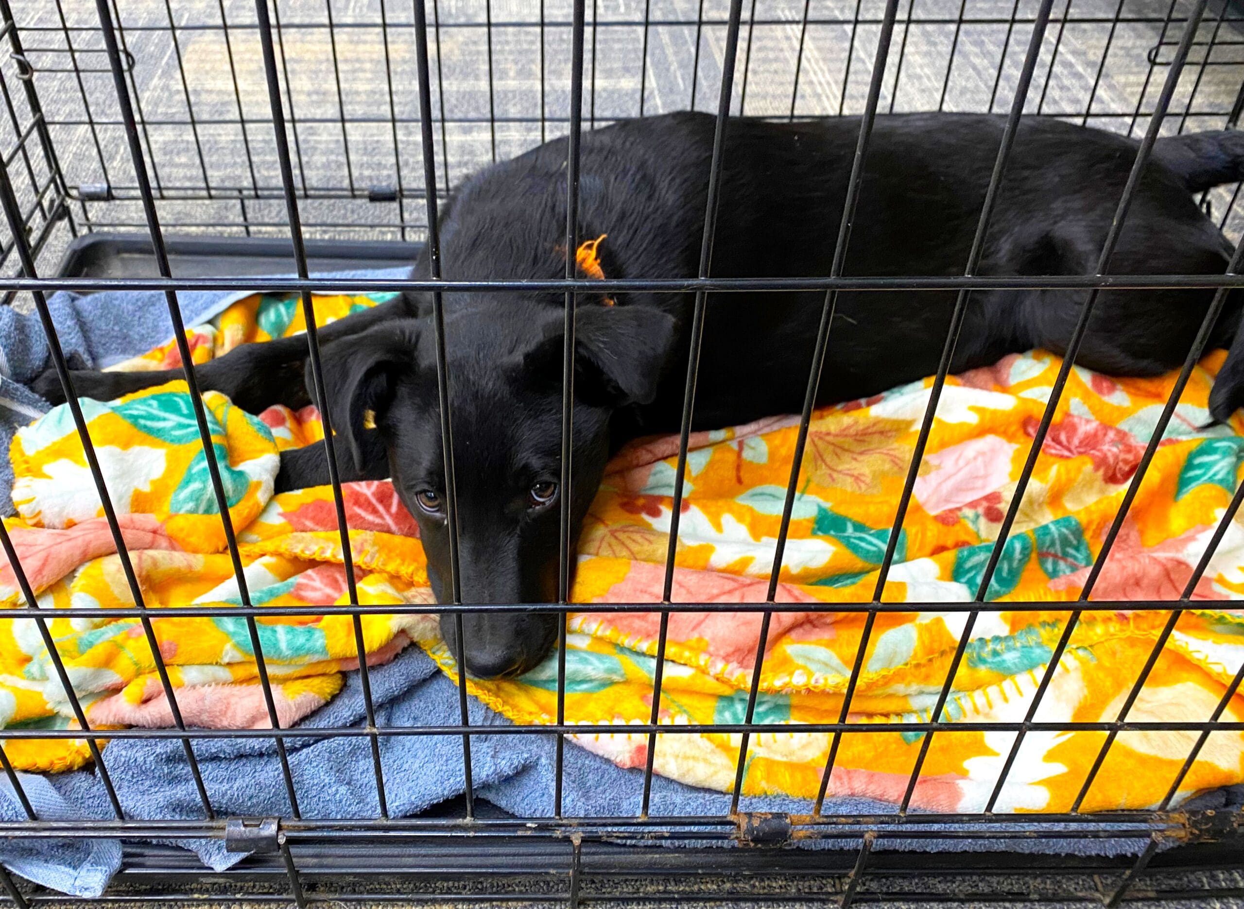 Puppies puppies puppies_Black puppy resting in crate