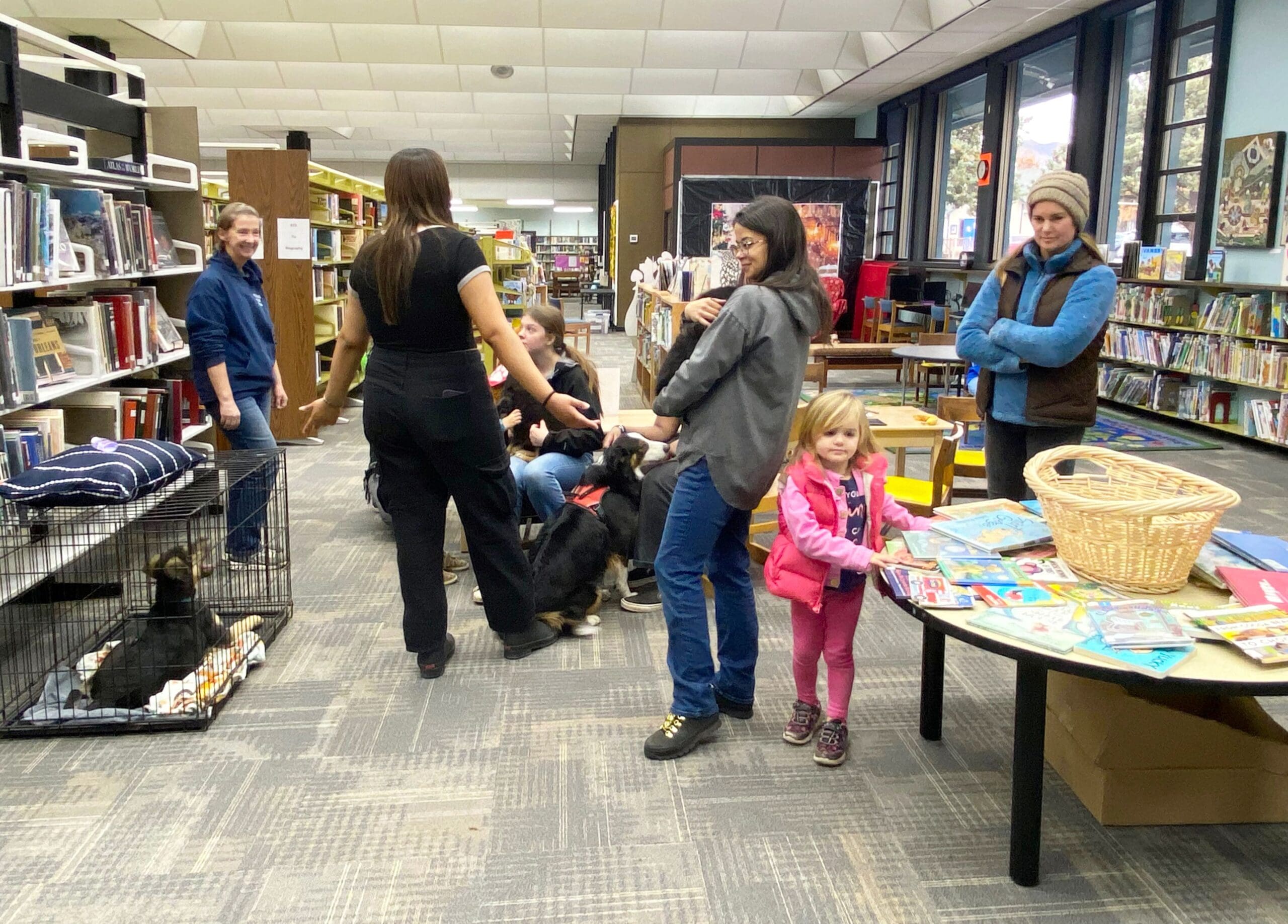 ws Karen_visitors_ and crated pup in library