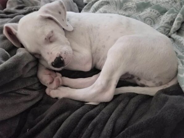 He also suffered cinder burns on his body. The scabs have since healed, leaving behind pink scars. His face and paws weren’t as severely burned as some of the adult dogs that came in, but his claws did fall out after a while. They were eventually replaced by healthy new growth.