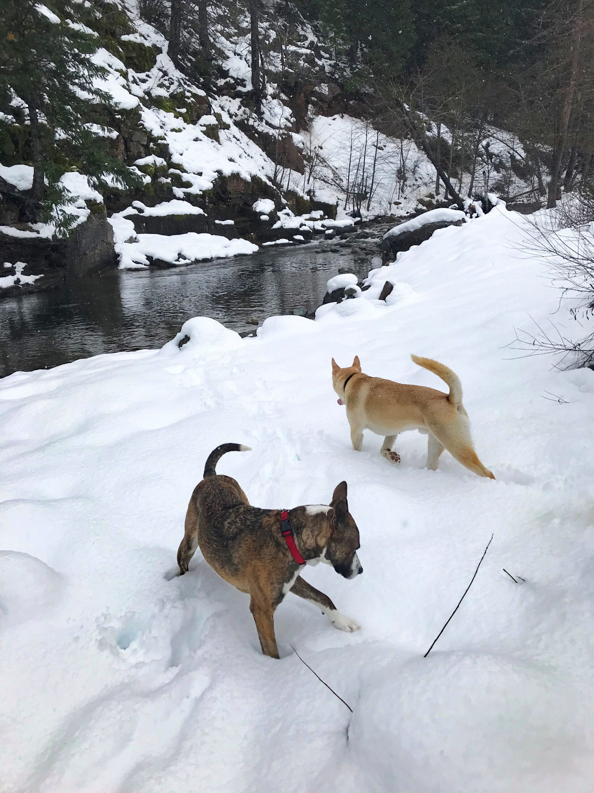 Home » Perfect Matches: Catching Up With 2 Lucky Rescue Ranch Dogs » Wally and Larry playing in snow next to river