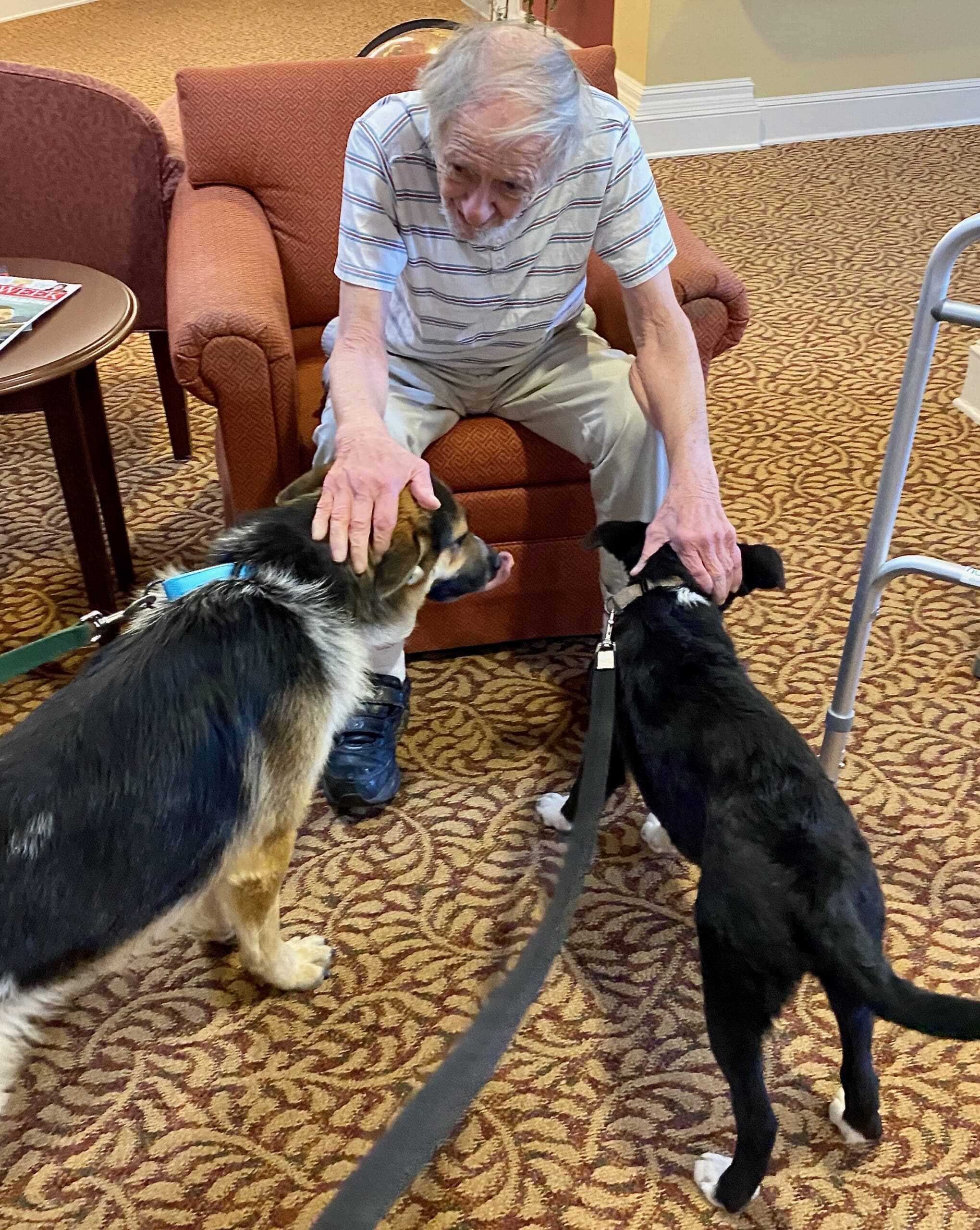 Home » Pet Therapy With Rescue Ranch Pups Brings Joy to Senior Living » Bronco_Ember_greeting_gentleman_Pet_Therapy