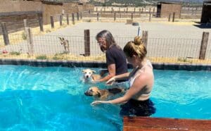 Home » Puppy pool party! Summer fun for dogs and staff at Rescue Ranch Sanctuary » Puppy pool party_Jula and Laura with puppies in the pool 2