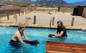 Home » Puppy pool party! Summer fun for dogs and staff at Rescue Ranch Sanctuary » Puppy pool party_Jula and Laura with puppies in the pool