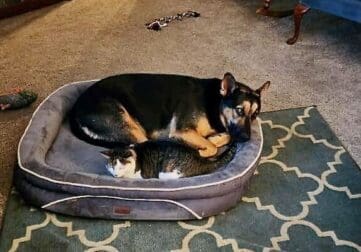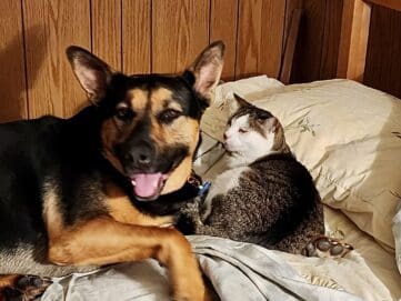 Noble was clean and well-mannered and had no trouble adjusting to Suzi’s home. He was a big dog now, but he crawled right through the cat door to access the yard. He even accepted Suzi’s cats. Though unfamiliar with their attention, he allowed them to rub against him and lay across his face.