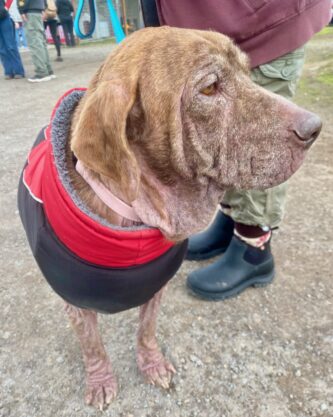 After several months in Bobbie’s loving care, Esperanza’s skin grew increasingly yeasty and irritated once more. Her weekly medicated baths were also proving a challenge for her caregiver. So longtime foster Maureen Horne took over for several weeks. When I caught up with them on Valentine’s Day, Maureen said Espy was itchy but incredibly chill and affectionate, “the kind of dog you can curl up and watch old movies with.” She loves everyone and gets along with everybody, including Maureen’s persnickety pack of heelers. Talk about a diamond in the ruff!