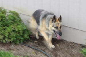 Cleo zooming behind bushes in yard