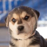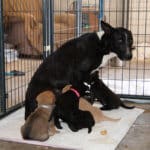 We’ve named the golden-brown mom, Nutmeg, and the black and white one, Harlequin. Despite their different colored coats, we think they may be related. Both are probably less than two years old. Nutmeg did well, especially once she was reunited with her 10 puppies. Harlequin, though, was utterly shut down at first. Frozen. Now, although she’s still wary, she’s nursing her seven pups and interacting more with her caretakers. Eventually, we expect them all to be available for adoption.