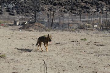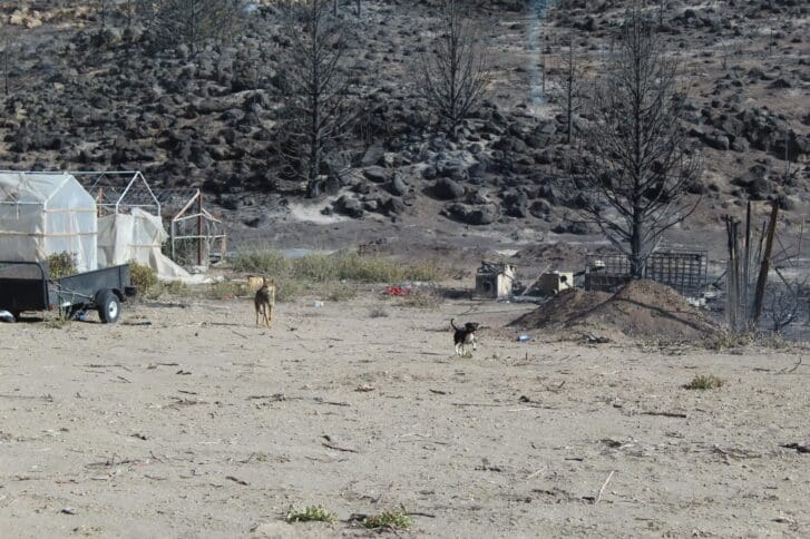 Helicopters overhead repeatedly doused hot spots north of our position. When we arrived on-site, the dogs emerged exhausted and confused from their hiding places among the debris. We recovered three dogs from two sites. A fourth one was too traumatized and refused to be captured. We left behind food, water, and shelter. We’ll monitor him until we can catch him and bring him to safety.