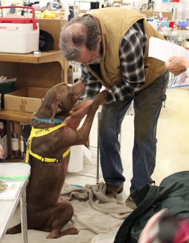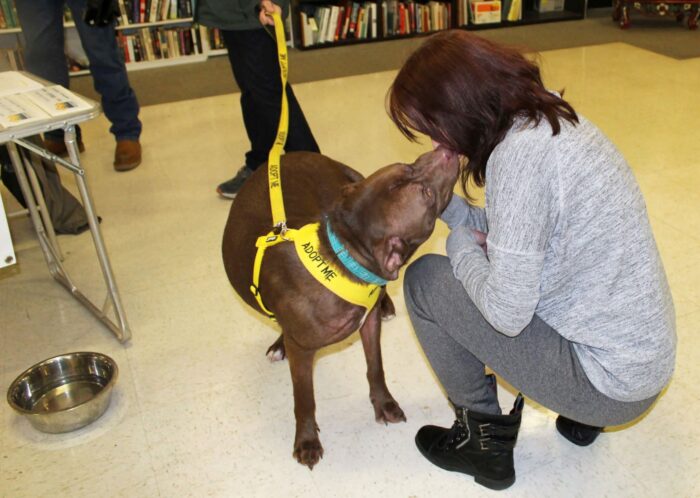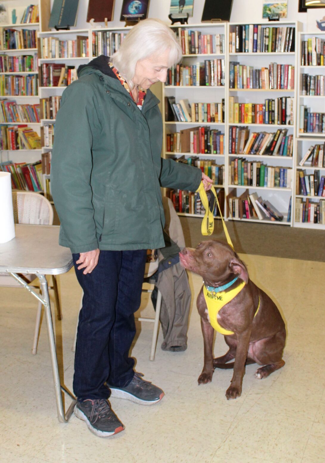 Sue and Bill Doron set up Rescue Ranch table at the back of the store, near the books. Mina kept them company and greeted visitors with kisses and a tail wag. Friendly, young Mina is one of the many adoptable dogs available at the Adoption Center.
