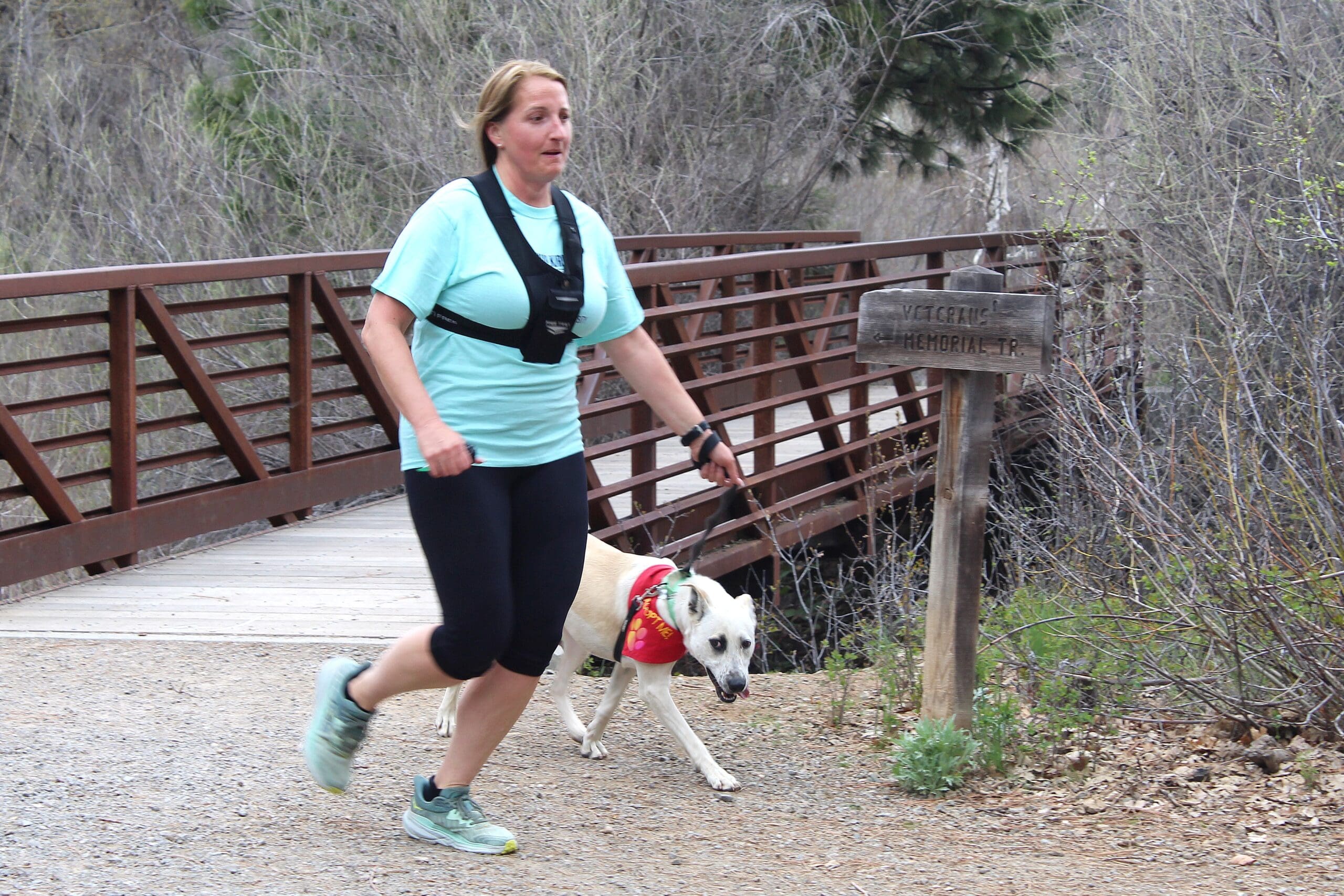 Home » Shelter Dogs Shine Bright At 5k Run Hosted By Karuk Youth Leadership » Shelter dogs_Hannah across the bridge with volunteer handler