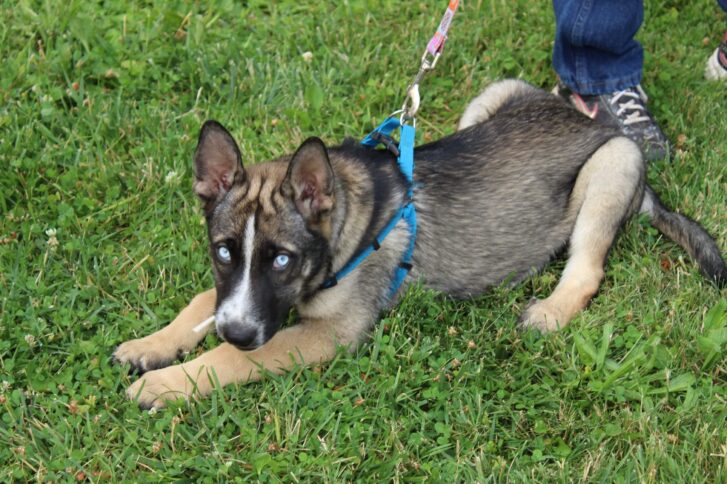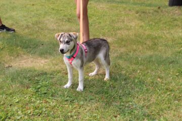 Feta loved being out of her crate and cooling her tummy on the fresh green grass. Dottie was eager to meet people and go for walks. Mischief enjoyed being held by visitors. For their part, Zeke and Zola, played non-stop for hours with visiting children. By 1:30 p.m. the puppies were so exhausted, they just had to take a short nap. Un Sunday, Pitbull mix, Olive, caught the attention of visitors with her exuberance and good humor. The children showered her with love and she licked their faces in response.
