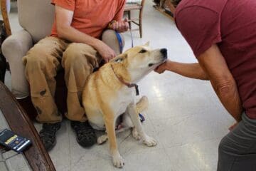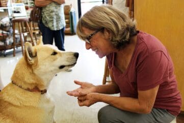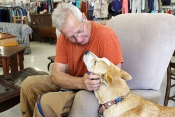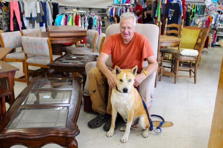The Thrift Store’s welcoming, dog-friendly atmosphere is well-suited to rescues in need of a break and low-pressure socialization. Initially a bit guarded, Chase began to relax as staff and visitors showered him with love. Soon he was just basking in the attention. As they left for Bill’s house, he was a happy and smiling pup.