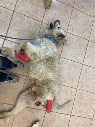 Atlas came through surgery like a champ. He still needs time to heal, but he’s more comfortable and at less risk of reinjuring himself. Eventually the vet will also have to address the wound on his right front leg, but he’s improving every day and already getting around well on three legs.